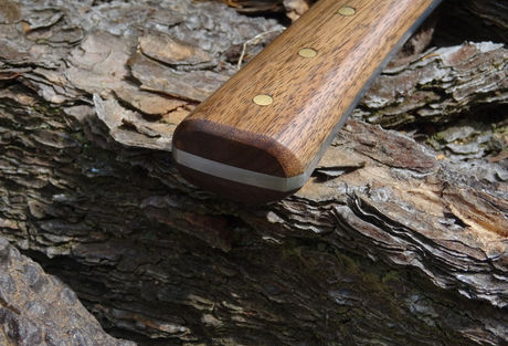 Kuchyňský nůž Almazan. Lépe spíše pojmenováno jako variace na nůž Cai dao. Celková délka 310 mm, délka čepele 185 mm, výška čepele 95 mm a tloušťka ve hřbetu cca. 3,5 mm. Ocel 1.2003, parciálně kaleno. Na ručce Ořešák královský a mosazné piny.