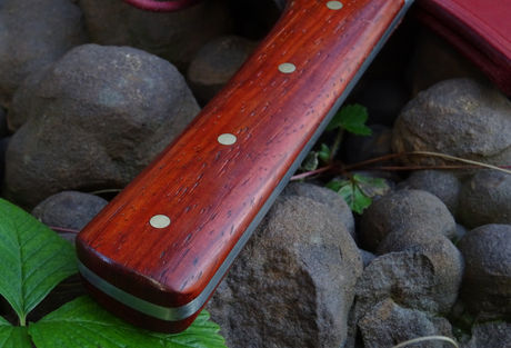 Kitchen knife Almazan, marked also as Serbian kitchen knife. But better is named him as free variation on Chinese kitchen knife Cai dao. Total length 310 mm, length of blade 185 mm, high 85 mm, approx 3,4 mm thickness. Steel W.Nr. 1.2003 (similar to AISI 1075). Partially hardened. On handle Padauk wood and brass pins. Sheath colored cowhide.