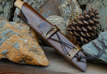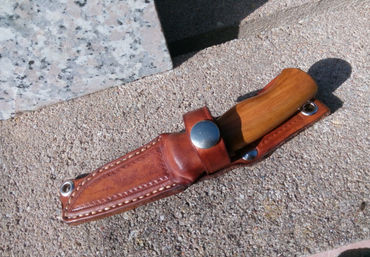 18# Outdoorový nůž, ocel 54SiCr6 (14260). Montáž na trn s koncovou maticí. Celková délka 215mm , délka čepele 105 mm, výška čepele v nejvyšším místě 29mm. Tloušťka čepele v nejširším místě 4mm. Záštita konstrukční ocel, na ručce dřevo ze švestky, záslepka z kosti. Pouzdro hovězí useň.