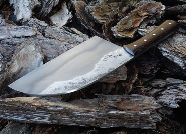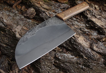 27# Almazan alias variace na čínské kuchařské nože. Celková délka cca. 310 mm, délka čepele 185 mm, výška čepele 85 mm a tloušťka ve hřbetu cca. 3,4 mm. Ocel 1.2003, parciálně kaleno. Na ručce Padouk a mosaz piny.