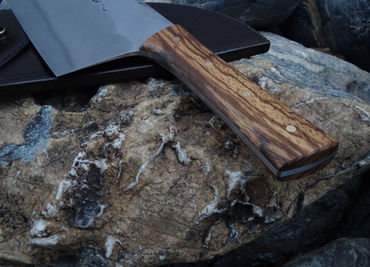 31# Almazan alias variace na čínské kuchařské nože. Celková délka cca. 295 mm, délka čepele 180 mm, výška čepele 80 mm a tloušťka ve hřbetu cca. 3,4 mm. Ocel 1.2003, parciálně kaleno. Na ručce Zebrano a mosazné piny. Přepravní pouzdro barvená hovězí useň.