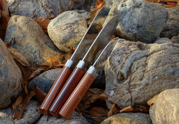 17# Sada kuchyňských nožů. Nerezová ocel N690, tvrdost 61 HRC. Celkové délky 285/245/170 mm, délky čepelí 180/140/75 mm, výška čepelí v nejvyšším místě 48/45/24 mm. Tloušťky ve hřbetu 2,6 a 2 mm. Nerezové bolstry, dřívko ze švestky a nerezové piny.